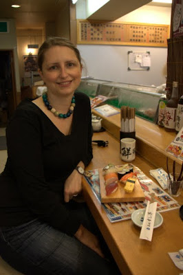 Among other places where we tried it, we ate sushi at a conveyor belt restaurant in Tokyo. The sushi keeps on rolling by. You pick what strikes your fancy and they tally up your plates at the end.