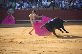 Each time, a bull would be released into the ring. It would stumble around, looking confused. Then one of the matadors would entice it to come over with a pink cape, and the bull would take off running. They would egg the bull on for a while, provoking it to charge at the pink capes, until a man on a horse would come out. The bull would take all of its anger out at the horse and charge at its side. The horse, who was blindfolded by the way, would stumble around while the rider on top stabbed at the bull with a long sword. Fortunately, the horses now wear armor. For a time, more horses were killed in bullfights than bulls.