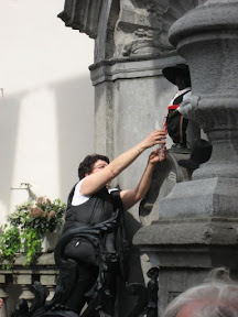 When we passed by the statute again later in the day, people in brightly colored costumes danced and sang, while the woman who changed his outfit earlier stood in the fountain, holding up shot glasses to the āpeeā stream.Ā The āpeeā was now some sort of alcohol instead of water, which lucky recipients in the crowd received.Ā Meanwhile, a man with a serious mustache pushed around a cart with a replica of the pissing boy leering down at the crowd.Ā To clear the street of people, he lurched the cart forward, sending āpeeā through the air towards unsuspecting bystanders.