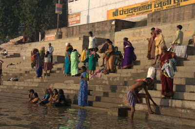 Everyone is doing their own thing in close proximity as if the others aren't there. Bathing, laundry, praying, sitting.
