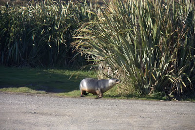 We didn't spy any penguins from the hide at Roaring Bay, but did see a sea lion sunbathing on the beach.
